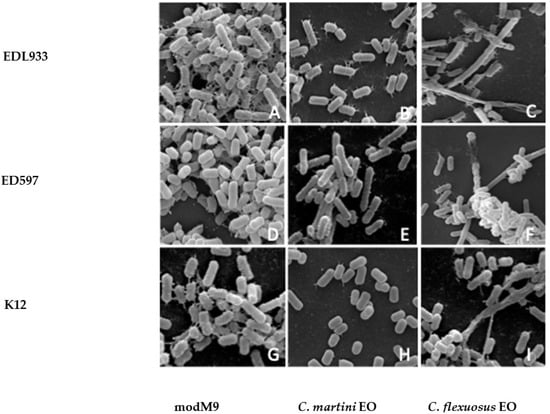 The results obtained showed that E. coli O157:H7 strains had a similar behavior, thus in Figure 4 we reported only EDL933, ED597 and the non-pathogen strain. Although this method of investigation does not allow for quantitative assessments, it was evident from the SEM images that the number of cells was higher in modM9 than in strains treated with EOs. In addition, bacteria grown in minimal medium formed a biofilm composed of intact cells, organized in a dense multilayer structure, embedded in a rich matrix network of polysaccharide material (Figure 4A,D,G). In accordance with the results of inhibition biofilm assay in presence of EOs, the cells exhibited unorganized biofilm cells, scattered and interconnected by a sparse network (Figure 4B,C,E,F,H,I). SEM observations showed considerable morphological alterations in cells treated with C. flexuosus EO (Figure 4C,F,I), similar to those observed with C. citratus EO (data not shown). In fact, the biofilm of each strain grown in modM9 was composed of rod-shaped cells, smooth, swollen and structured in a multilayer. In the presence of C. flexuosus or C. citratus EOs, the entire organization of the biofilm was altered, and the single cells appeared with evident morphological changes, becoming very elongated with loss of turgidity. SEM micrographs of biofilm obtained in the presence of C. martini and C. verum EOs (only data for C. martini EO are shown) highlighted sparse micro-colonies and individual cells with fewer and shorter interconnecting meshes between cells, but without evident morphological alterations (Figure 4B,E,H).