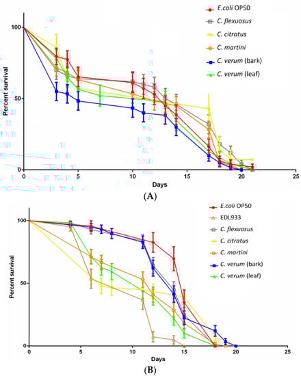 The in vivo antibacterial activity of EOs was tested on the C. elegans model system. Wild-type nematodes (N2 strain) were cultivated in Petri dishes containing nematode growth media (NGM) agar and a food source consisting of E. coli OP50 grown as a superficial monolayer. The nematodes were synchronized to obtain a colony of individuals at the same larval stage. First, 24-wells plates, containing 1 mL of NGM each well were prepared with 100 µM of ampicillin to avoid bacterial contaminations and 40 mM of 5-fluoro-2′-deoxyuridine (FUDR) to obtain sterile nematode was added to NGM agar. In order to evaluate the potentially toxic effects of EOs on C. elegans vitality, 50 µL of E. coli OP50 liquid culture were seeded into each well and incubated overnight at 37 °C to obtain a bacterial monolayer, with 50 µL of 0.05% (v/v) of C. flexuosus, C. citratus, C. martini and C. verum leaf EOs and 0.005% (v/v) of C. verum bark EO added to each well. Moreover, to assess the effects of EOs on E. coli O157:H7 ability to kill the nematode, an inoculum of 1 × 106 CFU/mL of EDL933 strain was grown overnight at 28 °C in the modM9 in the absence or presence of EOs and 50 μL of the treated and untreated inoculate containing EDL933 were added to each well of the dedicated plate. No treatment was applied to the negative control dedicated plate where E. coli OP50 was added. After preparing the 24-wells plates as described above, about 40 synchronized L4/young adult nematodes were transferred into plates (four nematodes for well) and scored as dead or alive on a daily basis by gently touching them with a platinum wire. Three independent experiments were conducted (approximately 100 L4/young adult nematodes tested for each treatment).