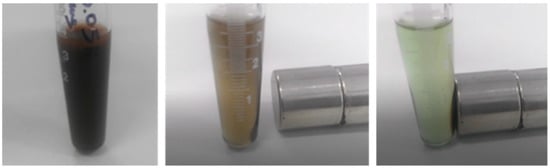 Different iron oxide nanoparticles were prepared by co-precipitation (see Section 3 for details), both capped and un-capped. The latter were obtained using two different polymers as capping agents, namely polyacrylic acid (PAA) and polyetherimide (PEI). Both polymer capped and un-stabilized SPIONs were used in the electrodecoration process, performed through the SAE technique [,,,]. The magnetite nanomaterials were directly added and dispersed in the electrochemical cell, along with the reaction solution containing the cationic surfactant benzyl-dimethyl-hexadecyl-ammonium chloride (BDHAC), which acted as the electrolyte and NPs stabilizer. In all the cases, the resulting colloid suspension demonstrated magnetic behavior which allowed the magnetic separation of the particles from the medium (Figure 1). Despite this behavior, the polymer capped SPIONs did not show any iron-copper interaction due to presence of both polymer and CuNPs stabilizer. Therefore, all the investigation was performed using only the un-stabilized SPIONs.