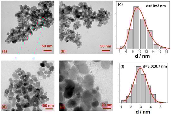 The SPIONs morphology is represented in Figure 2, where transmission electron microscopy (TEM) images of bare and electrodecorated Fe3O4 are reported, along with the relative size distribution histograms. As-prepared magnetite is characterized by a “grape structure” morphology with spherical shaped particles, as evident in Figure 2a,b. The average size diameter has been measured to be 10 ± 3 nm (Figure 2c).