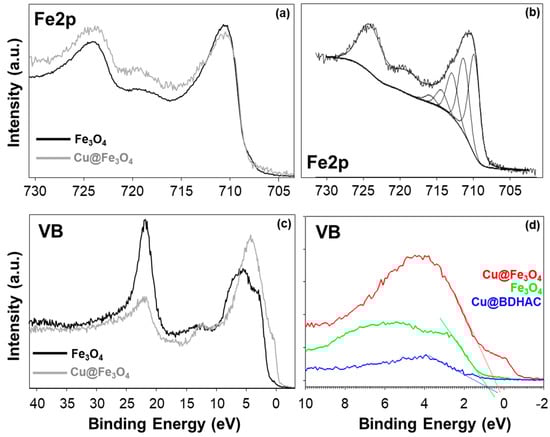 Much more information was derived from VB regions (Figure 3c,d): that part of a XP spectrum is well-known to be too complex to be fitted, but it appeared to contain features belonging to ferric and ferrous oxide spectra [,]. Therefore, from the overall information (O/Fe ratio, Fe2p curve fitting and VB) it was possible to state that our magnetite, both as prepared and copper modified, is indeed in a mixed form of Fe2O3/FeOOH. However, comparing the VB spectra (Figure 3c) important differences were visible in the region near the Fermi level, where the hybridization of Fe3d states strongly influences the line shape []. These findings included deepened overlapping VBs of the bare Fe3O4, the CuNPs@BDHAC and the Cu@Fe3O4 (Figure 3d) and determining the valence band maximum (VBM) by linear extrapolation. The energy band gap value (Eg) for CuNPs was found to be 0.8 eV, compatible with the value for copper oxide [,], and coincident with the value for bare magnetite. In the latter case, the value has been calculated to be in the range 0–2 eV, depending on the particle size. The most interesting result is the shift to 0.3 eV for the electrodecorated sample, indicating the occurring of alignment of the Fermi levels at the Cu–Fe material interface [,].