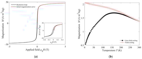(a) Initial magnetization curve (red) and hysteresis loop (black) at 5 K; Inset: detail of the low-field region; (b) Zero field cooling–field cooling curves obtained with an applied field of 2 kA/m.