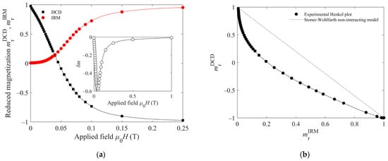 The moderate decrease in the FC curve in Figure 4b indicates some interaction among the particles, consistent with the absence of capping shell. The remanence plot technique has been used to investigate the nature of such interactions. The technique relies on the difference between the magnetization curves measured by the IRM and DCD methods. The key difference in both curves is that the former starts for each measured point from the demagnetized state, while the latter begins with the sample’s magnetic saturation. Both experimental curves are plotted in Figure 5a, the horizontal axis representing the applied magnetic field H, and the vertical axis the reduced remanent magnetization calculated as the magnetization relative to the saturation value (mr (H) = Mr (H)/Mr (H→∞)).