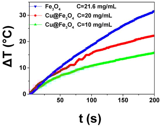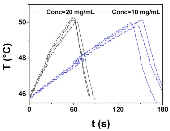 The heating performance can be adjusted by modifying the concentration of the magnetic material or the inductive device parameters (intensity and frequency of the alternating magnetic field) to meet the adequate conditions for each specific application. In Figure 8, heating peak cycles of two dispersions of Cu@Fe3O4 MNPs with different concentrations (20 mg/mL and 10 mg/mL), subjected to a 30 min treatment of magnetic hyperthermia cycles, have been plotted together to illustrate the effect of magnetite concentration on the heating efficiency. The magnetic nanomaterial concentration allows us to tailor the temperature increase rate (ΔT/Δt), to produce a moderate or fast heating. From the data in Figure 8, we deduce that reducing the concentration of magnetic NPs form 20 mg/mL to 10 mg/mL can lower more than twice the hyperthermia heating rate from 5.72 °C/min to 1.97 °C/min.