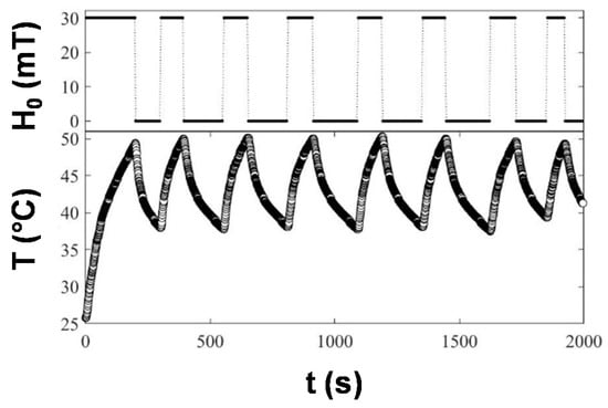 SPIONs have the unique advantage of being able to be reversibly activated and deactivated under demand by applying an external magnetic field and without exhibiting persistent remanence or magnetic aggregation, as presented in the ferromagnetic microparticles. Taking advantage of this, different applications are envisaged by different authors, as nanocarriers for drug delivery and magnetic hyperthermia therapies for non-invasive treatment of tumors [,,]. Since only relatively small increases in temperature produce a large effect on cancer cell viability, single domain MNPs can be efficiently used to absorb power from the field through magnetic relaxation processes and dissipate it through a temperature increase in the tumor that triggers the apoptosis the tumoral cells [].