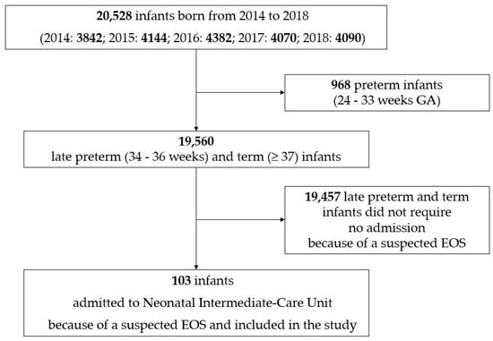 During the five-year study period, 20,528 infants were born in our III-level hospital. Of them, 103 late preterm and term infants were admitted to our Neonatal Intermediate-Care Unit because of a suspected EOS, started on intravenous antibiotics, and enrolled into the study (Figure 1).