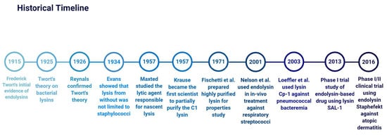 The knowledge that phage lysates contain enzymatic activity that could cause in vitro lysis of bacteria was initially documented by Frederick W. Twort during his discovery of bacteriophages []. Twort noted in his seminal manuscript what was perhaps the first evidence of endolysins, stating that there appeared to be a non-transmissible, heat-labile property that produced transparent zones of lysis []. We now attribute this to either endolysins or virion-associated peptidoglycan hydrolases (VAPGHs) of the staphylococcal phage []. Importantly, endolysins, are different from virion-associated peptidoglycan hydrolases (VAPGHs) as endolysins are secreted at the end of the phage lytic cycle []. In contrast, VAPGHs are released from phage tail tips at the initial stage of peptidoglycan penetration []. Twort later defined a “transmissible virus” (bacteriophages) as only acting on live bacteria, whereas a non-transmissible “bacterial lysin” secreted by the virus would act on dead bacteria []. To accompany this theory, dead staphylococci could not be lysed by phage unless a small amount of live staphylococci was added, which released some emerging agents []. By 1926, phage biologist F. D. Reynals confirmed Twort’s lytic findings by performing identical experiments on both Gram-positive and Gram-negative species, and noting that it was specific only to Gram-positive species [].