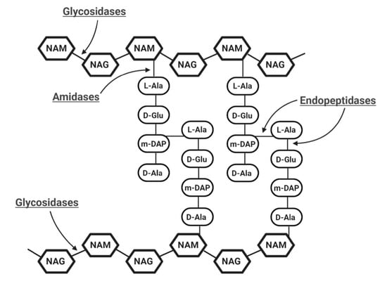 - Endopeptidases cleave bonds between two amino acids of the stem peptide. Bond cleavage can either occur within interpeptide bridge or stem peptide–interpeptide bridge []. Examples include L-alanoyl-D-glutamate endopeptidase (VANY), c-D-glutamyl-m-diaminopimelic (DAP) acid peptidase, D-Ala-m-DAP endopeptidase, D-alanyl-glycyl endopeptidase (CHAP), etc. [,].