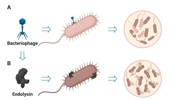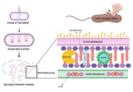 The structure of a tailed phage consists of two parts: the icosahedral head which contains and protects the phage genome and the tail, which attaches to the specific receptor site on the bacterial cell wall. Bacteriophage injects its DNA into bacteria via its tail, and a progeny phage is produced. These newly produced phages go on to lyse bacterial cells []. The release of phage progeny at the end of the lytic cycle is facilitated by holins and lysins. Within the bacterial host cell at the late stage of phage lytic cycle, holin is produced, which makes a hole in the bacterial cytoplasmic membrane and creates a channel to facilitate lysin delivery to the bacterial peptidoglycan, which results in cleavage of specific peptidoglycan bonds and disrupts the bacterial structure (Figure 4) [].