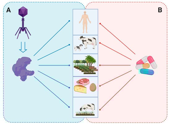 Bacteriophage endolysins as an antibacterial agent. (A) Phage-derived endolysin protects humans, animals, plants that are extremely infected with antibiotic-resistant pathogens and also inhibits the prevalence of antibiotic resistance via other food chains. (B) Overuse of antibiotics in food chains and human and veterinary medicine causes uncontrollable bacterial infections with multidrug resistance that leads to future pandemics.