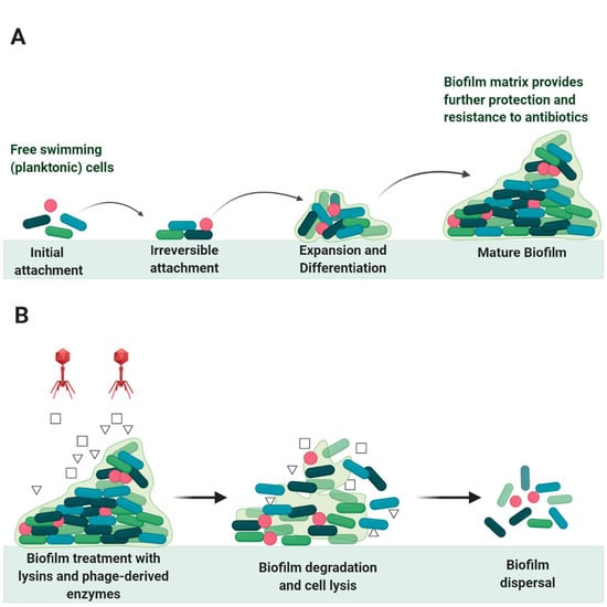 Biofilm growth stages and degradation: (A) the stages of bacterial biofilm formation from the initial attachment to mature biofilm formation, (B) the process of biofilm dispersal using phage endolysins and phage-derived enzymes as agents of biofilm degradation and bacterial cell lysis.