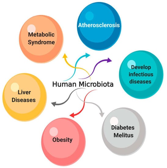 The human host is colonized with a large number of microbial cells as part of their normal microbiota, covering different parts of the human body such as the urogenital and gastrointestinal tracts, the nasal and oral cavities, and the skin surface []. It is estimated that more than 100 trillion symbiotic microorganisms colonize human beings and are of great significance to human health and illness []. The normal microbiota forms a physical barrier to protect its host from foreign pathogens, through competitive exclusion and antimicrobial production []. Any disturbance to the normal microbiota may cause serious disease. For example, intestinal microbiota dysbiosis influences the level of immune mediators’ production leading to metabolic dysfunction and chronic inflammation []. Additionally, hepatitis B virus (HBV), human immunodeficiency virus (HIV), and other diseases are associated with microbiota disturbance [].