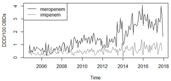 - Tóth, H.; Fésűs, A.; Kungler-Gorácz, O.; Balázs, B.; Majoros, L.; Szarka, K.; Kardos, G. Utilization of vector autoregressive and linear transfer models to follow up the antibiotic resistance spiral in gram-negative bacteria from cephalosporin consumption to colistin resistance. Clin. Infect. Dis. 2019, 69, 1410–1421. [Google Scholar]