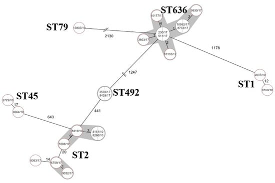 - Woodford, N.; Ellington, M.J.; Coelho, J.M.; Turton, J.F.; Ward, M.E.; Brown, S.; Amyes, S.G.B.; Livermore, D.M. Multiplex PCR for genes encoding prevalent OXA carbapenemases in Acinetobacter spp. Int. J. Antimicrob. Agents 2006, 27, 351–353. [Google Scholar] [CrossRef]