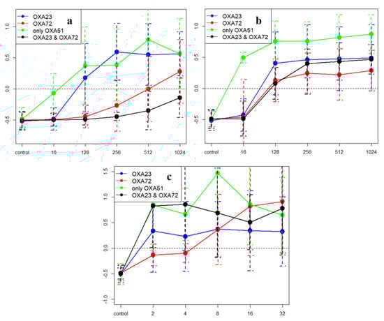 - Héritier, C.; Poirel, L.; Fournier, P.E.; Claverie, J.M.; Raoult, D.; Nordmann, P. Characterization of the naturally occurring oxacillinase of Acinetobacter baumannii. Antimicrob. Agents Chemother. 2005, 49, 4174–4179. [Google Scholar] [CrossRef] [PubMed]