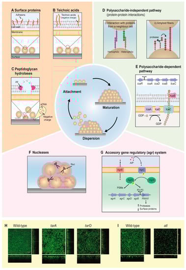 After the initial attachment, a process known as maturation consolidates the transition from planktonic to sessile bacterial life. During this stage, the major part of the EPS is formed, promoting intercellular adhesion and allowing cells to accumulate in multiple layers to form a three-dimensional community. In staphylococci, the formation of the EPS can be achieved through two main pathways: a polysaccharide-dependent (Figure 1E) and a polysaccharide-independent pathway (Figure 1D).