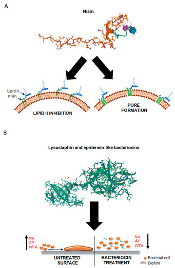 Model of anti-biofilm and bactericidal action of bacteriocins. (A) The structure of nisin in conjugation with lipid II is shown along with a representation of its dual mechanism of action. By interacting with lipid II molecules exposed on the cell surface, the bacteriocin inhibits the cell-wall biosynthesis and leads to pore formation in the bacterial cell membrane. (B) The structure of lysostaphin is shown as a representative example of staphylococcins. Its anti-biofilm action relies in part on the perturbation of wall teichoic acid (WTA), the function of which has been shown to be important in the process of biofilm formation. Epidermin-like bacteriocins (e.g., epidermin and gallidermin) follow a similar mode of action, and also lead to the downregulation of biofilm-promoting genes such as ica and atl. The protein structures were obtained from the Research Collaboratory for Structural Bioinformatics (RCSB) Protein Data Bank (PDP) (http://www.rcsb.org).