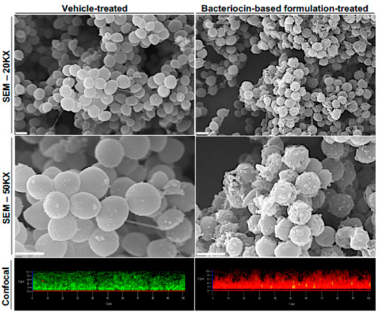 The effects of the treatment with the bacteriocin formulation or its control vehicle [197] were visualized by scanning electron microscopy (SEM) (greyscale pictures—scale bar = 1 μm) and by confocal microscopy (color pictures—scale bar = 10 μm) using differential dye incorporation in order to mark living (green) and dead (red) cells. Note that the treatment with the formulation led to severe damage of the bacterial cells, with an apparent leakage of their content, more evident at high magnifications (50KX). Consistently, the treatment also led to a uniform switch in the pattern of dye incorporation, and therefore viability, of biofilm-associated cells for green (living) to red (dead). See reference [198] for methodological details.