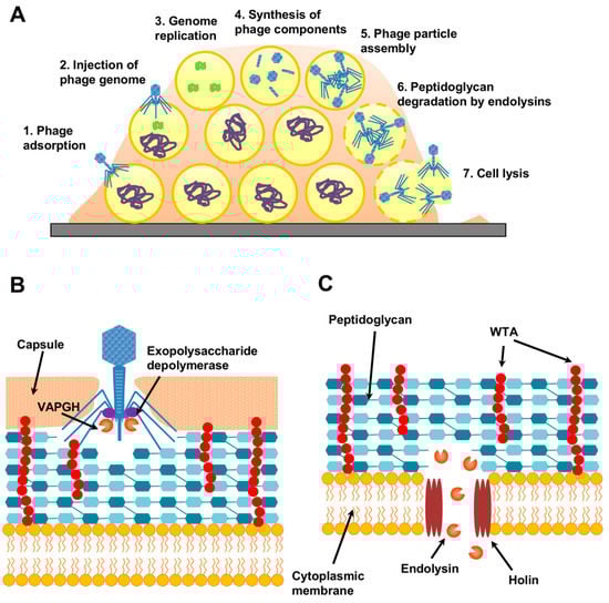 Bacteriophage replication through the lytic cycle. (A) Phage-infected S. aureus biofilm in which different cells are undergoing consecutive stages of the lytic cycle, while others remain uninfected. (B) Virion-associated proteins with antibiofilm potential that participate in early stages of the lytic cycle (VAPGHs and exopolysaccharide depolymerases). (C) Role of endolysins in cell lysis at the end of the lytic cycle. WTA, wall teichoic acids.