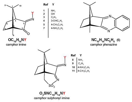 In the present work, several sets of camphor imine ([Ag(NO3)(XC10H14NY)] (X= O or N, Series a), [Ag(OC10H14NY)2((μ-O)] (Series b), [Ag(OH)(OC10H14NY)2] (Series c)), and camphor sulfonimine complexes ([Ag(NO3)(O2SNC10H14NY)2] (Series d), [Ag(OH)(O2SNC10H14NY)2] (Series e), and [Ag(OH)(O2SNC10H14NY)] (Series f)) were synthesized, analytically and spectroscopically characterized, and their antibacterial activities determined, in order to get insights into the effect of structural changes at the camphor ligand or inner sphere on the antibacterial properties of the complexes.