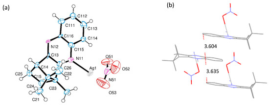 The unit cell of complex 6a is formed by a silver ion (Ag(I)) coordinated to the nitrogen atom of one of the imine nitrogen atoms of the ligand. This unit bridges the Ag(I) site of a neighbor unit through the amine nitrogen atom of the ligand, forming a one-dimensional network (coordination polymer, Figure 2c) (N-Ag-N = 168.6(2) deg). A parallel 1D alignment of the nitrate ion (NO3−) equilibrates the positive charge of the silver cationic units, as shown in Figure 2c. Only one of the oxygen atoms in the nitrate anion is at nearly bonding distance from the silver atom (Ag–O51, 252.5(7) pm), occupying an orthogonal position with respect to the imine nitrogen atom (95.9(5) and 94.8(5) deg), generating a T-shaped ML3 metal center, as shown in Figure 2a.