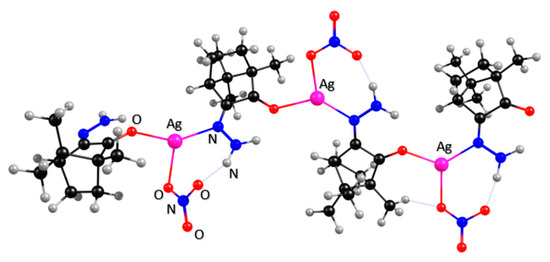 Analytical data shows that 6a and 1a have in common the 1:1 metal to ligand ratio and conceivably the same polymeric arrangement. However, they differ in the ionic (6a, λM = 142 ohm−1 cm2 mole−1) and neutral (1a, λM = 64 ohm−1 cm2 mole−1) character, as verified through measurement of conductivity in acetonitrile solutions (1 × 10−3 M) [14]. The ionic character of 6a was confirmed by X-ray analysis. In order to get further insights into the structural differences of 1a and 6a, calculations using density functional theory (DFT) were undertaken for 1a based on an oligomer as a model compound for the coordination polymer. The oligomer was built by adding “mer” units incrementally making the chain grow. The four silver camphor units, as shown in Figure 3, can explicitly show the structural trends of the polymer as an illustrative example. Further computational details are given in Section 3.