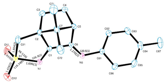 Camphor sulphonyl imines (O2SNC10H13NY), as shown in Figure 1, differ from camphor imines (OC10H14NY) in an extra five members ring annulated to the camphor skeleton and presence of the sulphonyl imine group (NSO2) while keeping the imine substituent (Y, at position 3, Figure 1). For comparison purposes, a new camphor sulfonimine ligand (SO2NC10H13NC6H4CH3−4) was synthesized (see Section 3) and structurally characterized by X-ray diffraction analysis, as shown in Figure 4.