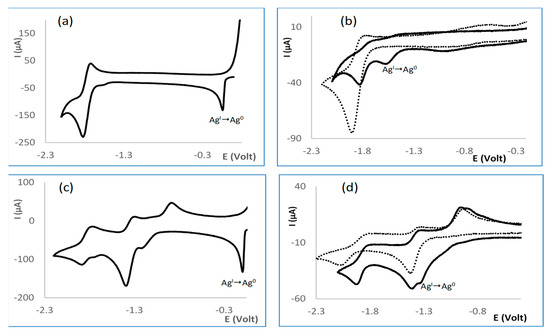 Representative cyclic voltammograms, as shown in Figure 5, highlighting the Ag(I)→Ag(0) reduction wave are displayed for complexes 5a, 7c, 9d, and 10f. Dotted lines refer to the cyclic voltammogram of the free ligands, as shown in Figure 5b,d, evidencing proximity to metal reduction.