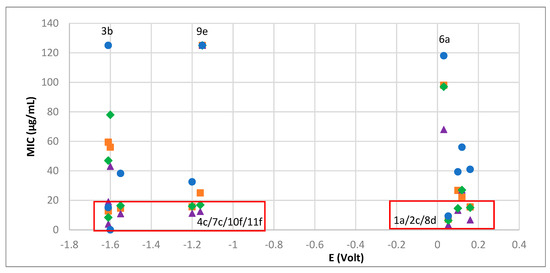 The rationalization of the antibacterial and electrochemical data shows that complexes which reduce at low potentials display low MIC values, except 9e that displays low potential and low activity. Additionally, complexes able to bond with hydrogen (1a, 2c, 8d) can overcome the unfavorable effect of the high Ag(I) reduction potential and display high antibacterial activity at least for some bacteria strains, as shown in Figure 6.
