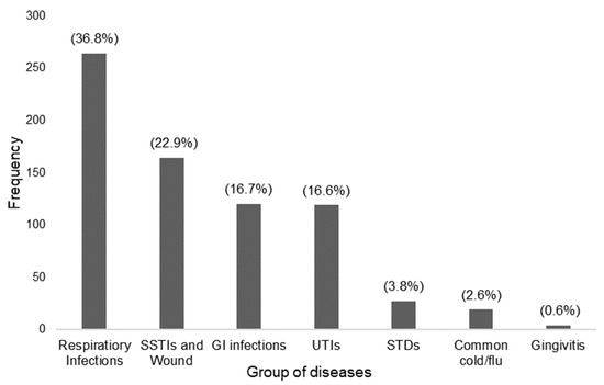 Community pharmacists were asked about the most commonly encountered infections in their practice setting for which they needed to dispense antimicrobials (without a prescription) using an open-ended question. A total of 717 responses were recorded. These were coded and grouped as shown in Figure 1.