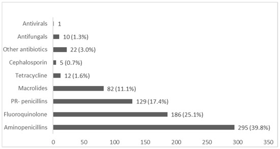 Community pharmacists provided a total of 742 responses when asked about the most commonly dispensed antimicrobials in their practice setting. Amoxicillin, Amoxicillin/Clavulanic acid, and Ampicillin, grouped as aminopenicillins, were the most commonly dispensed antibiotics (39.8%), Followed by Fluoroquinolone (25.1%) and Penicillinase-resistance penicillin (17%). Findings are shown in Figure 2.