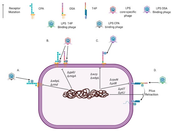 LPS is composed of lipid A (membrane embedded domain), a core (domain connecting lipid A and O-antigen), and O-antigen (polysaccharide that extends extracellularly). P. aeruginosa expresses three types of O-antigen, which include the common polysaccharide antigen (CPA; homopolymer O-antigen), O-antigen specific (OSA; heteropolymer O-antigen), and uncapped antigen (no or one O-antigen sugar). Therefore, resistance mutations for LPS-exploiting phages vary according to which LPS component or type the phage specifically binds (Figure 1). Mutations to T4P can occur in genes encoding structural components, therefore preventing the receptor being created or those that drive pilus retraction for twitching motility (Figure 1). Retraction of T4P is required by pili-specific P. aeruginosa phages because it allows them to meet the host membrane and continue infection [97]. Additionally, receptor mutations range from single base-pair alterations to >100 kbp multi-gene deletions (Supplementary Table S1). Receptor mutations can also have wider effects than the phage receptor through altering genes with multiple functions (Supplementary Table S1). In some cases, large or regulatory gene mutations may be beneficial to P. aeruginosa by providing cross-resistance to other phages, they can also result in increased fitness costs [98]. Oechslin et al. (2016) found that a phage-resistant mutant carrying a large genomic deletion had increased susceptibility to ciprofloxacin and by exploiting this via combined phage-antimicrobial therapy, resistant bacterial mutants were suppressed. However, even small mutations to phage receptors, when phages are not present, have been shown to attenuate bacterial growth [78,99], biofilm formation [100,101], motility [71,78,101,102], antimicrobial resistance [71,96], virulence, and infectivity [71,78,103].