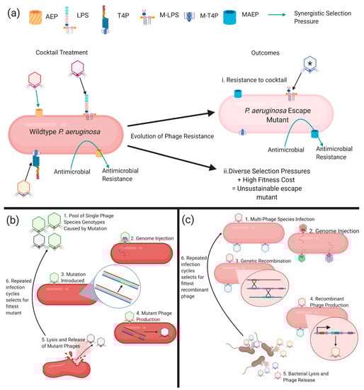 (a) The rationale for strategic cocktail formulation. Cocktails contain phages that use different receptors like lipopolysaccharide (LPS), type IV pili (T4P,) or antimicrobial-resistant determinants (antibiotic efflux pumps; AEP) so that their addition with antimicrobials provides opposite and synergistic selection pressures. This will result in outcome i, where resistance arises to the phage cocktail through mutations that alter the availability of phage receptors. For example, this outcome may result in a mutated LPS (M-LPS), a mutated T4P (M-T4P), and a mutated antibiotic efflux pump (MAEP) with conserved efflux function. This outcome can be prevented by adding the phage (denoted by *) to the cocktail that specifically kills the escape mutant, therefore forcing further different mutations in the bacteria, which could result in outcome ii, whereby the selection pressures are so diverse and come with a high fitness trade-off that resistance is unsustainable. (b) Phage evolution by spontaneous small mutation during DNA replication. (c) Phage evolution by genetic recombination between multiple phages. Created with BioRender.com.