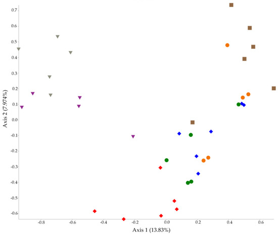 In addition, the Permutational Multivariate Analysis of Variance (PERMANOVA) test has shown that beta diversity metrics were always statistically different between groups (p = 0.001 for caecum and p = 0.002 for ileum). Principal Coordinate Analysis (PCoA) plots were generated both for caecum and ileum using beta diversity metrics and are presented in Figure 1 (caecum) and Figure 2 (ileum).