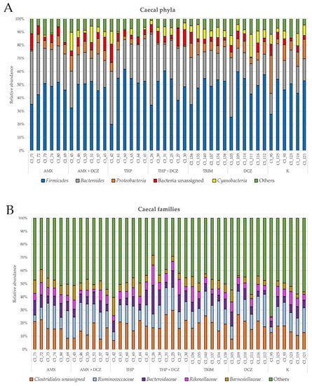 Relative abundance at the phylum (A) and family level (B) in caecum. Specific legends are reported for each bar plot.