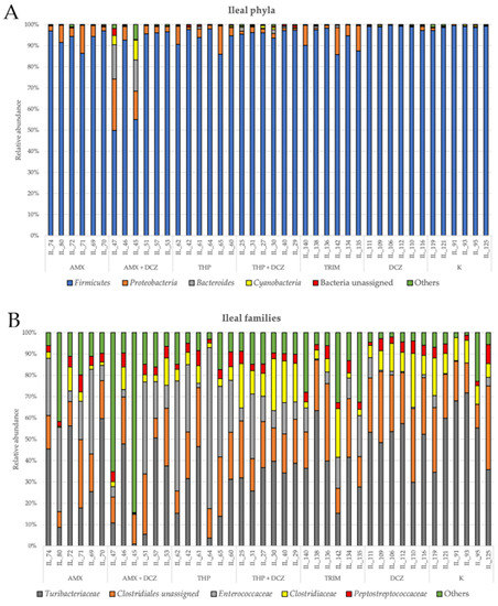 Relative abundance at the phylum (A) and family level (B) in ileum. Specific legends are reported for each bar plot.