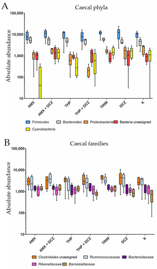 Box plots of two-way ANOVA analysis for caecal phyla (A) and families (B).