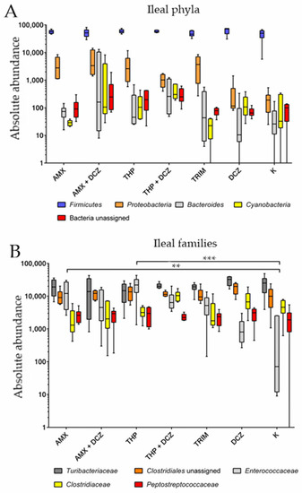 Box plots of two-way ANOVA analysis for ileal phyla (A) and families (B). (** p-value < 0.01; *** p-value < 0.001).