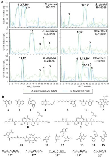 Antimicrobial activity and specialized metabolites detected in semipreparative fractions of six Burkholderia isolates. (a) Growth reduction observed per HPLC fraction. Numbers indicate specialized metabolites detected in active fractions and correspond with the chemical structures in panel b. (b) Chemical structures of compounds detected in active fractions. 1, reumycin; 2, toxoflavin; 3, pyrrolnitrin; 4, C17H21NO; 5, antibiotic SF 2420B; 6, ditropolonyl sulfide; 7, bactobolin A; 8, ornibactin C6; 9, ornibactin C8; 10, enacyloxin IIb; 11, cepabactin; 12, antibiotic BN-227-F; 13, C10H11NO2S3; 14, aerugine; 15, aeruginol; 16, C16H23Cl2N3O6; 17, C16H22Cl2N2O7; 18, C33H47Cl2NO13; 19, C47H61N3O16; 20, C9H9NO2S. Asterisks indicate putative novel compounds.