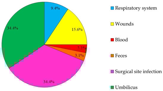 The distribution according to the source (body-site) from which the 3GCRE pathogen was isolated (n = 32 cultures).