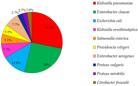 There were 39 3GCRE isolates, recovered from 32 clinical specimens, obtained from 29 patients. Twenty-one (65.6%) cultures were polymicrobial. Ten samples (31.25%) were collected from hospitalized equids during the first 48 hours of hospitalization, i.e., suggesting acquisition in the community [29]. The two most prevalent infectious syndromes were umbilical cord [30] and surgical-site infections (i.e., SSI; Figure 1). SSIs were following either laparotomy or orthopedic surgery (50% each). Of the 39 3GCRE isolates (Figure 2), the major pathogens were Klebsiella spp. (n = 14/39, 35.89%), Enterobacter spp. (n = 13/39, 33.33%), and Escherichia coli (n = 5/39, 12.82%). The resistance rates of the isolates to the commonly prescribed agents in veterinary medicine, in addition to β-lactams, are depicted in Figure 3. Nearly all isolates (38/39, 97.43%) were categorized as MDR organisms (MDRO) [24].