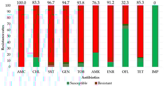 Resistance rates of 3GCRE pathogens (n = 39) towards commonly prescribed agents. AMC, amoxicillin-clavulonate; CHL, chloramphenicol; SXT, trimethoprim-sulfamethoxazole; GEN, gentamicin; TOB, tobramycin; AMK, amikacin; ENR, enrofloxacin; OFL, ofloxacin; TET, tetracycline; IMP, imipenem.