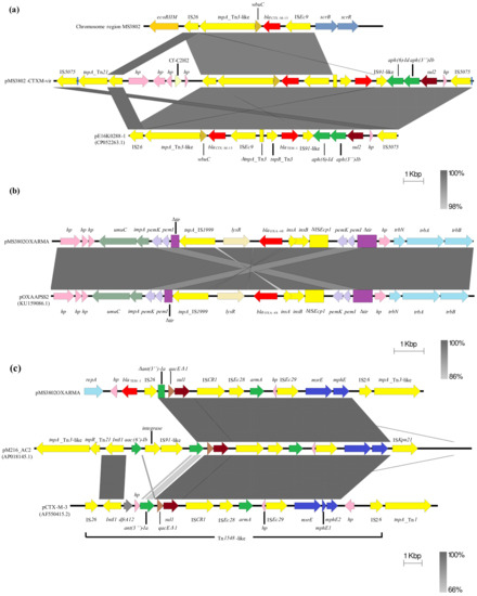 The transferability of plasmids was investigated by carrying out conjugation experiments. K. pneumoniae MS3802 was used as a donor and E. coli J53, resistant to sodium azide (Azr), was used as the recipient strain. Transconjugants were selected on MacConkey agar plates supplemented with piperacillin (50 µg/mL) or amikacin (40 µg/mL) and sodium azide (100 µg/mL). Transconjugants were confirmed by PCR with specific primers for amplification of blaOXA-48, and CTX-M-encoding genes [42] and armA [43], as well as susceptibility testing (Table 1).