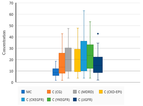We estimated the eGFR of patients with the CG, MDRD, CKDEPI, kinetic GFR estimation by Chen et al. (Ckegfr) ([28]) and Yashiro et al. (Ykegfr) [10] and Jelliffe and Jelliffe (JJGFR) estimators [23].