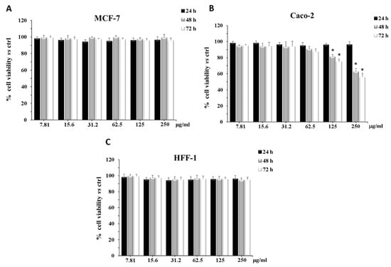 WPE did not modify the cell viability of MCF-7 and HFF1 cells independently of the treatment time and the concentration used (Figure 1A,C). Conversely, the treatment of Caco-2 cells with different concentrations of the extract reduced cell viability after 48 h and 72 h of exposure, in a dose-dependent manner and the inhibitory effects, at 250 µg/mL, reached a value of about 40% and 50%, respectively (Figure 1B).