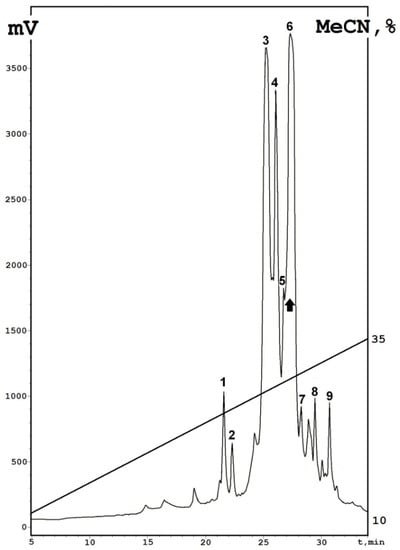 Reversed-phase HPLC (RP-HPLC) profile of 1 M fraction (fraction 4) after affinity chromatography on a Heparin-Sepharose column, washed with buffer containing 1M NaCl. All collected fractions characterized are indicated by ciphers; a dominant peak is marked by a black arrow. Axis: X—time, min; Y—is a digital signal axis (mAU, milli Absorbance Units).