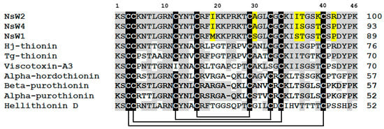 Multiple sequence alignment of nigellothionins and most homologous plant peptides deduced based on a BLASTP algorithm: NsW1, NsW2, and NsW4 from N. sativa; Hj-thionin from Hordeum jubatum [14]; Tg-thionin from Tulipa gesneriana (GenBank ID: CAA57353.1); viscotoxin A3 from Viscum album [15]; alpha-hordothionin from Hordeum vulgare [16]; Alpha-purothionin from Triticum aestivum [17]; hellithionin D from Helleborus purpurascens [18]. Cysteine residues are indicated by a white type on a black background; all identical residues are colored white-gray (relative to the NsW2 structure, which is outlined with a frame); amino acid substitutions between the thionins from N. sativa are marked in yellow. The degree of sequence identity (relative to the NsW2 structure) is represented by ciphers.