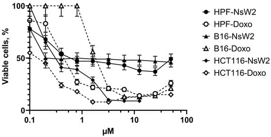 We observed a different pattern of cellular response to the NsW2 peptide incubation. HCT-116 cells showed an obvious concentration-dependent reaction on NsW2; the viability of HPF and B16 cells decreased by up to 50% and remained at the same level regardless of the increase in NsW2 concentration. The cell lines’ sensitivities to doxorubicin were not different. Thus, there is a relatively direct proportion between NsW2 and doxorubicin action towards HCT-116 cells, whereas the reactions of HTC-116 and HPF on doxorubicin were similar. Cell viability after NsW2 treatment decreased in a concentration-dependent manner. B16 cells were resistant to this compound up to 0.8 µM (Figure 3); their viability then fell to the same level as other cell lines.