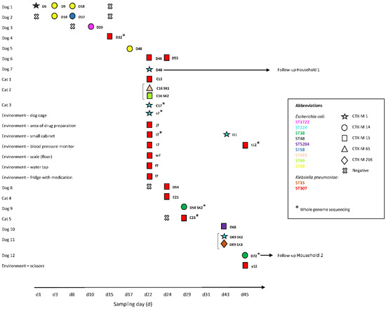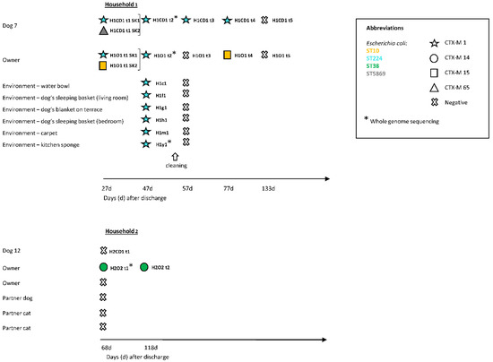 Two households were followed-up and were asked to send stool specimens of the colonized animal patient and its household contacts (owner, dogs and cats living in the same household) at different time points (Figure 4) and specimens from twenty-five surfaces with high human and animal contact in the household (Table S4) were collected. Furthermore, owners were asked to fill out a questionnaire on household hygiene (Table S2) [55,56,57]. There was no compensation for participating in the study.