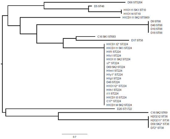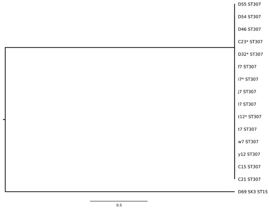 Multi-locus sequence typing-distance based phylogenetic tree for extended-spectrum beta-lactamase-producing Escherichia coli isolates. D, dog; C, cat; CD, colonized dog; O, owner; lower case letter, environment; H1, household 1; H2, household 2; D68, dog 10; D5, dog 1; H1O1 t1 SK1, owner household 1; H1O1 t4, owner household 1; H1CD1 t1 SK2 dog household 1; D9, dog 1; D40, dog 5; D10, dog 2; D18, dog 1; C16 SK1, cat 2; D17, dog 2; H1CD1 t2, dog household 1; H1CD1 t1 SK1, dog household 1; H1f1, dog’s sleeping basket (living room); H1c1, water bowl; H1O1 t1 SK2, owner household 1; s7, dog cage; D69 SK2, dog 11; H1m1, carpet; h1y1, kitchen sponge; H1g1, dog’s blanket on terrace; D48, dog 7; H1O1 t2, owner household 1; H1h1, dog’s sleeping basket (bedroom); i11, small cabinet; H1CD1 t3, dog household 1; C17, cat 3; H1CD1 t4 SK2, dog household 1; D26, dog 3; C16 SK2, cat 2; H2O2 t2, owner household 2; H2O2 t1, owner household 2; D58 SK2, dog 9; D72, dog 12; *, whole genome sequencing conducted.